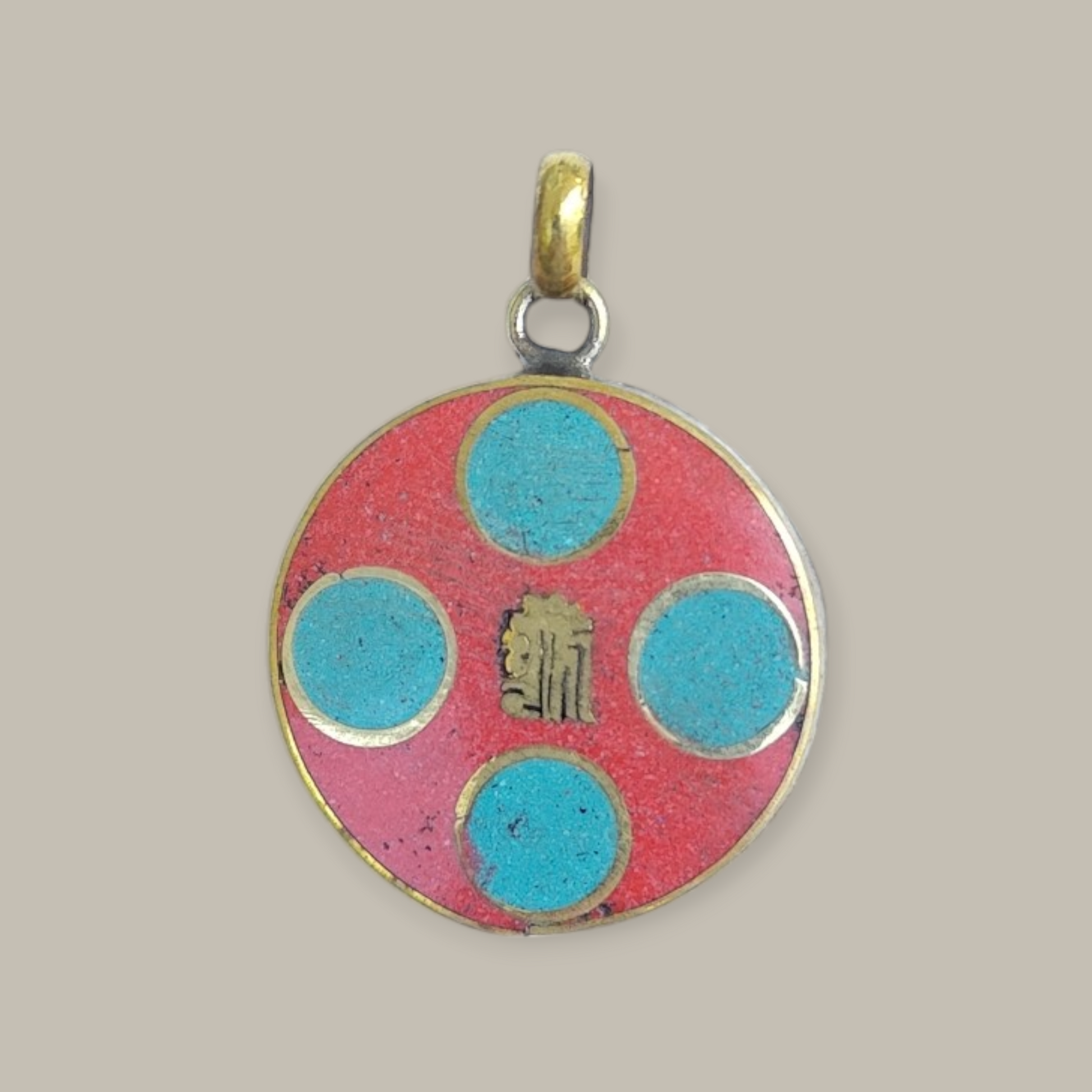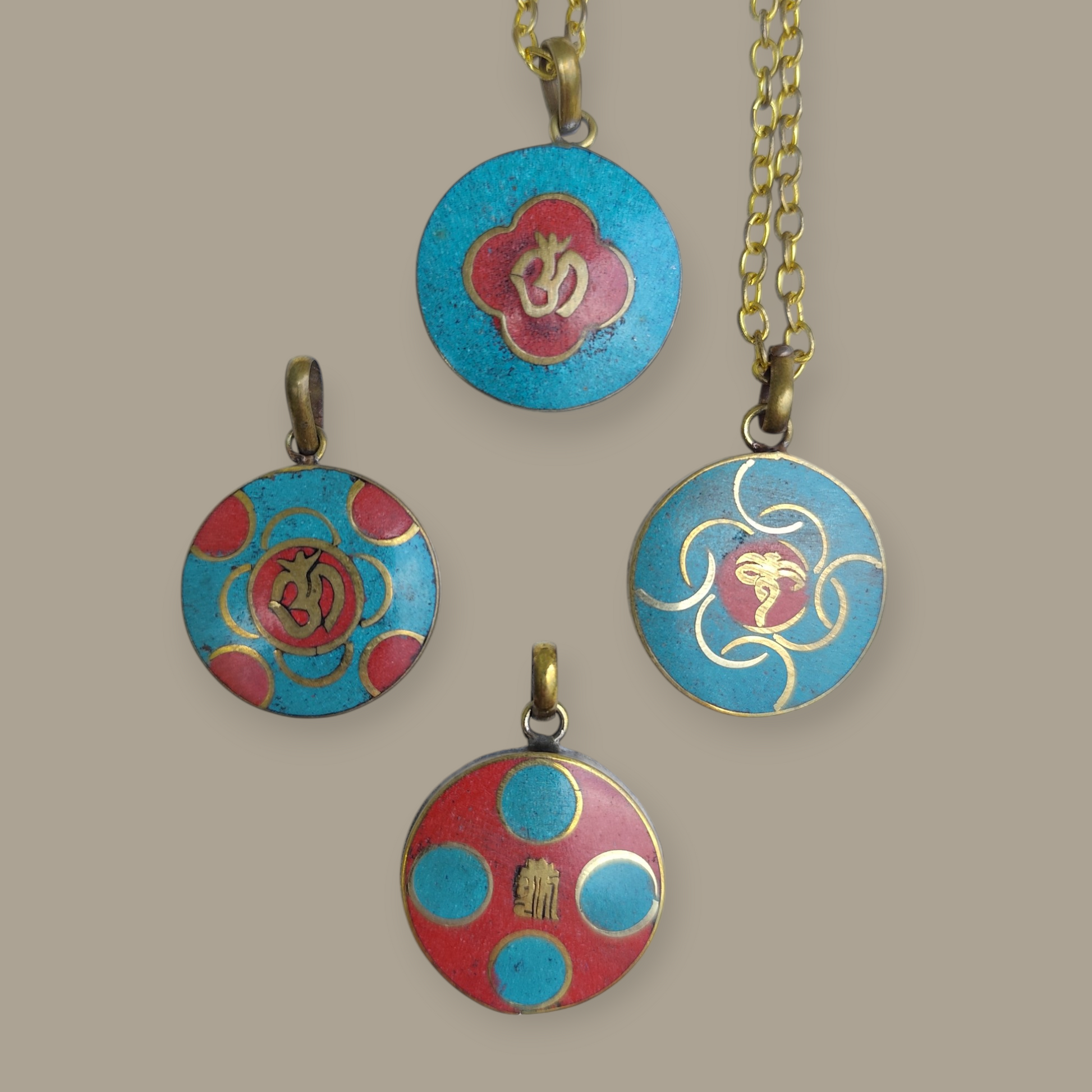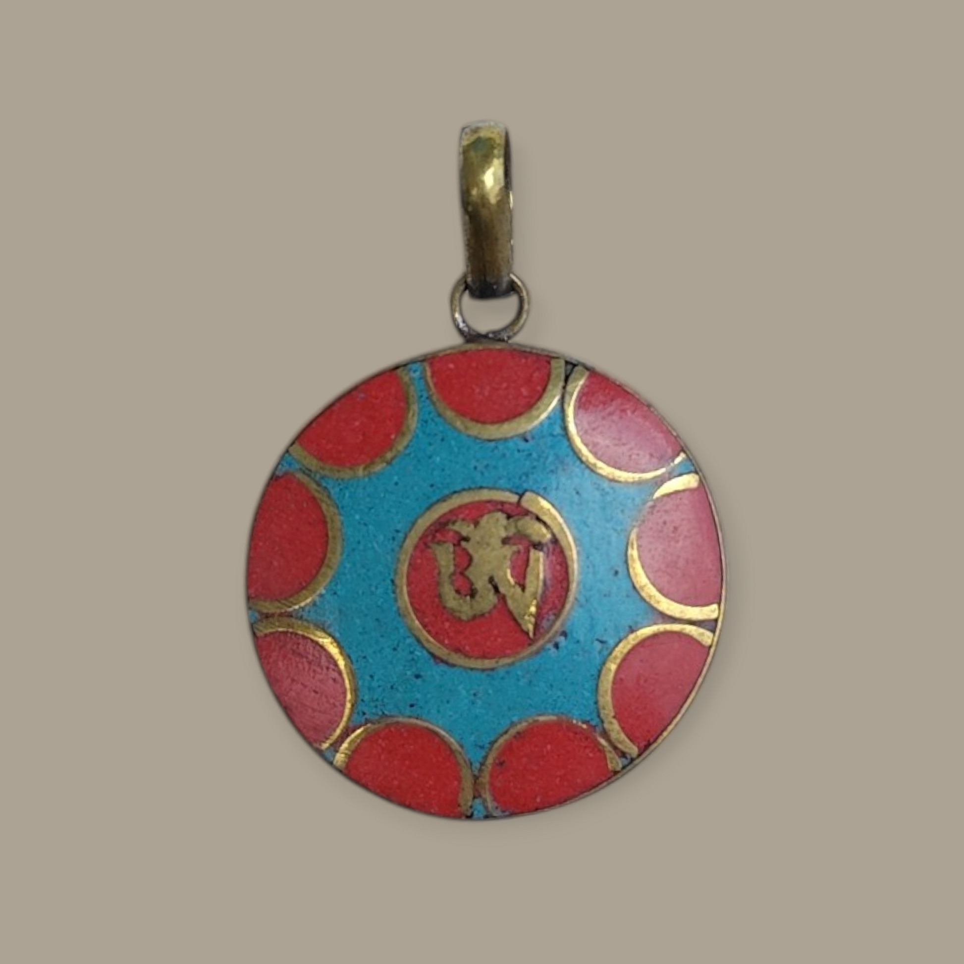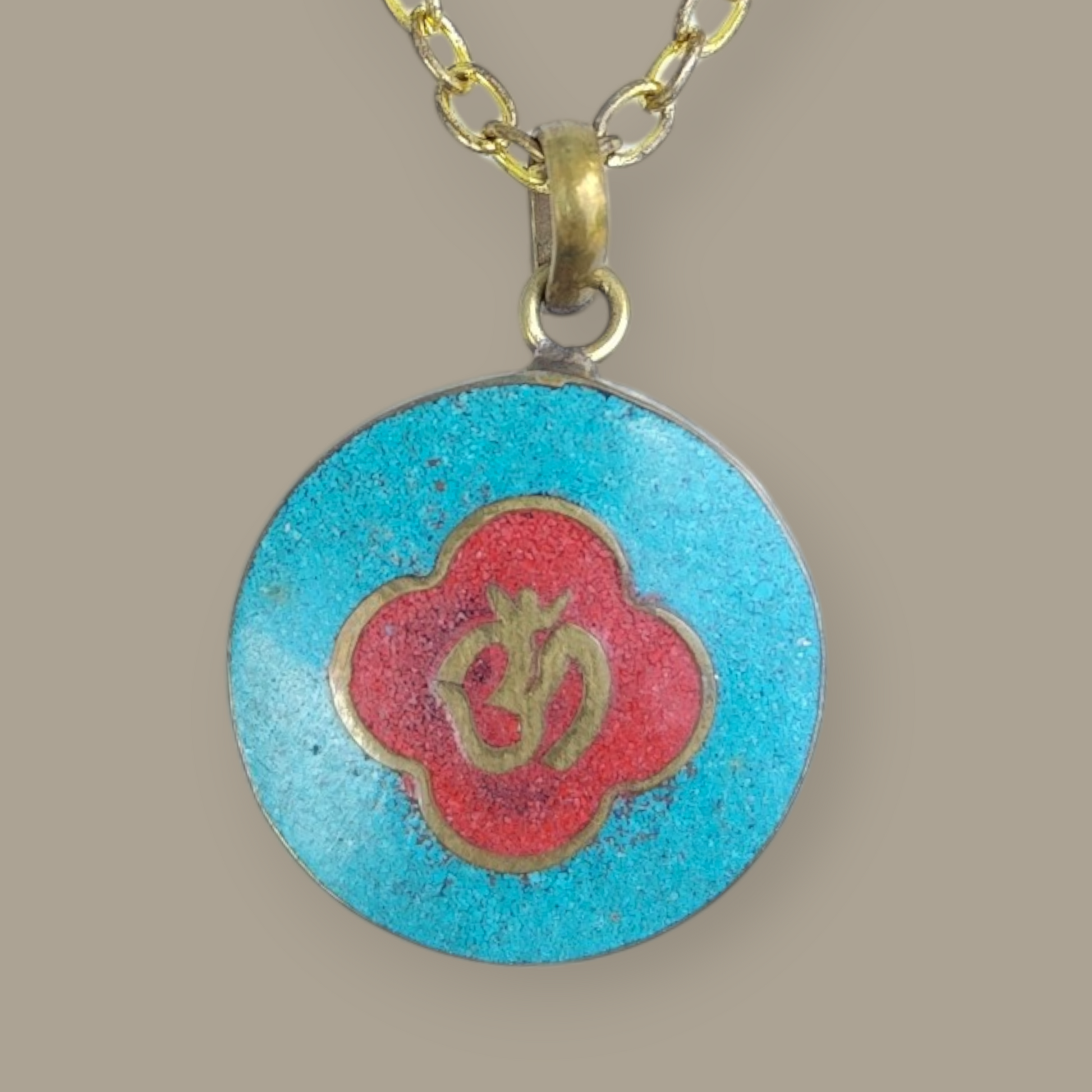 Tibetaanse natuursteen in messing 2,5 cm doorsnee. Ketting van messing (kan verkleuren).