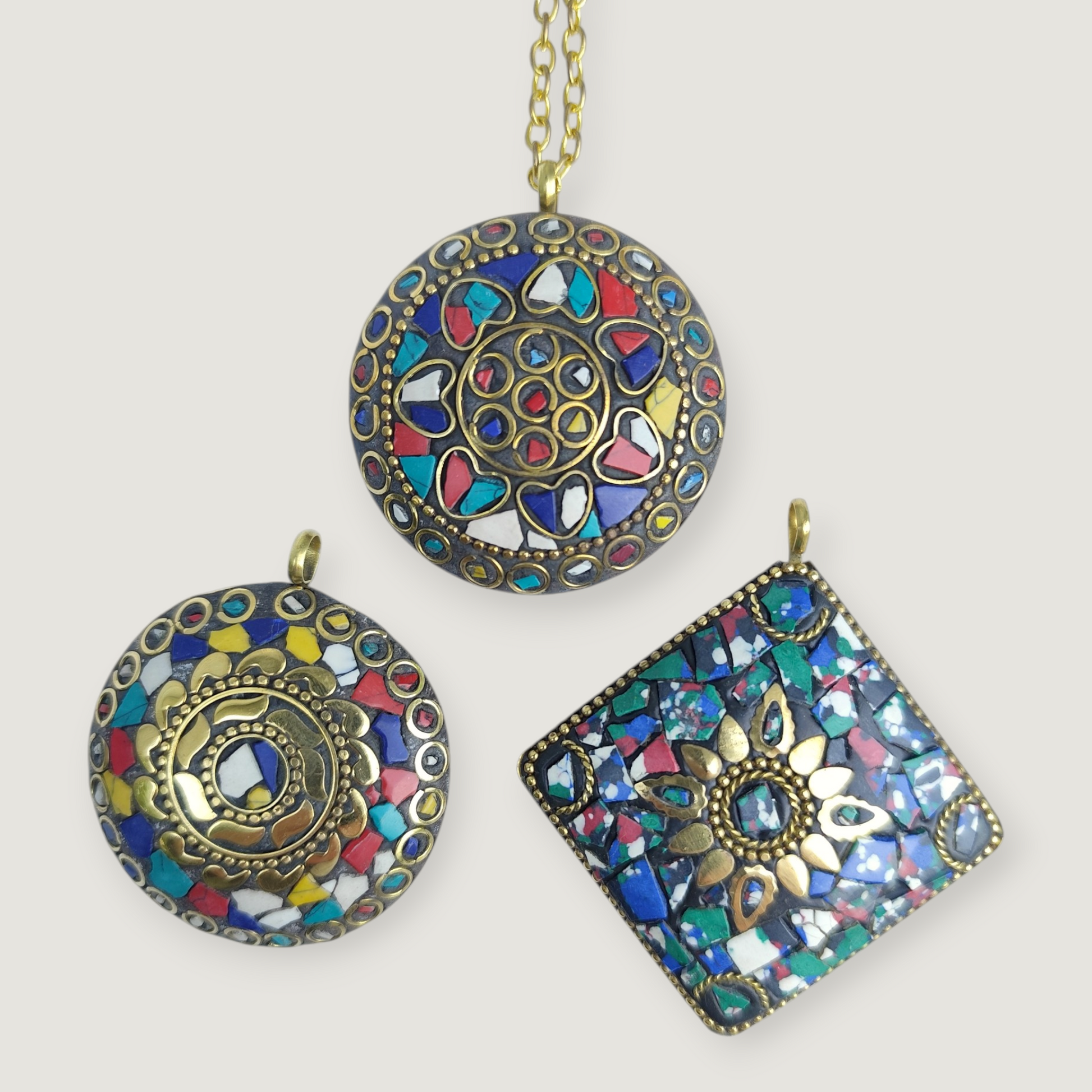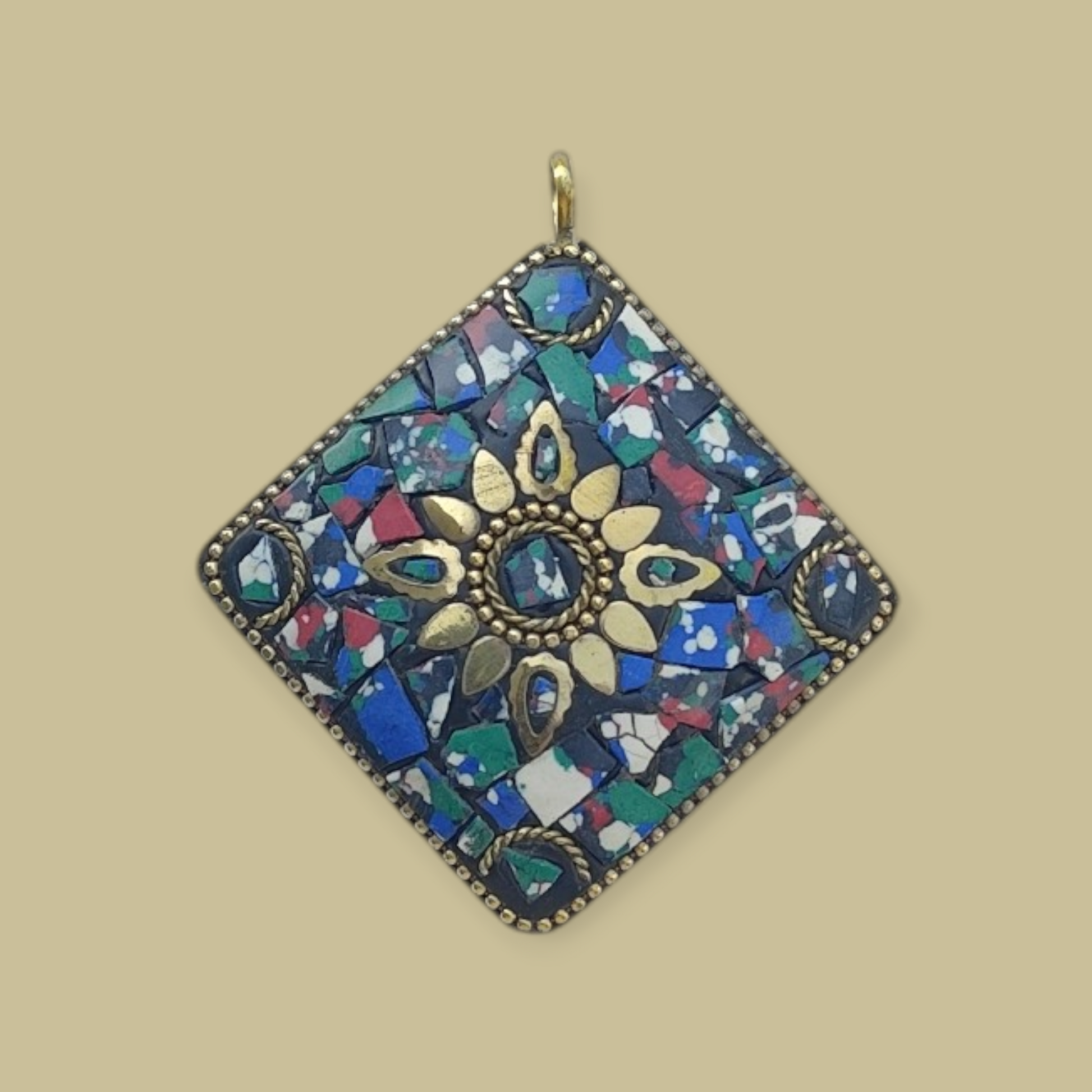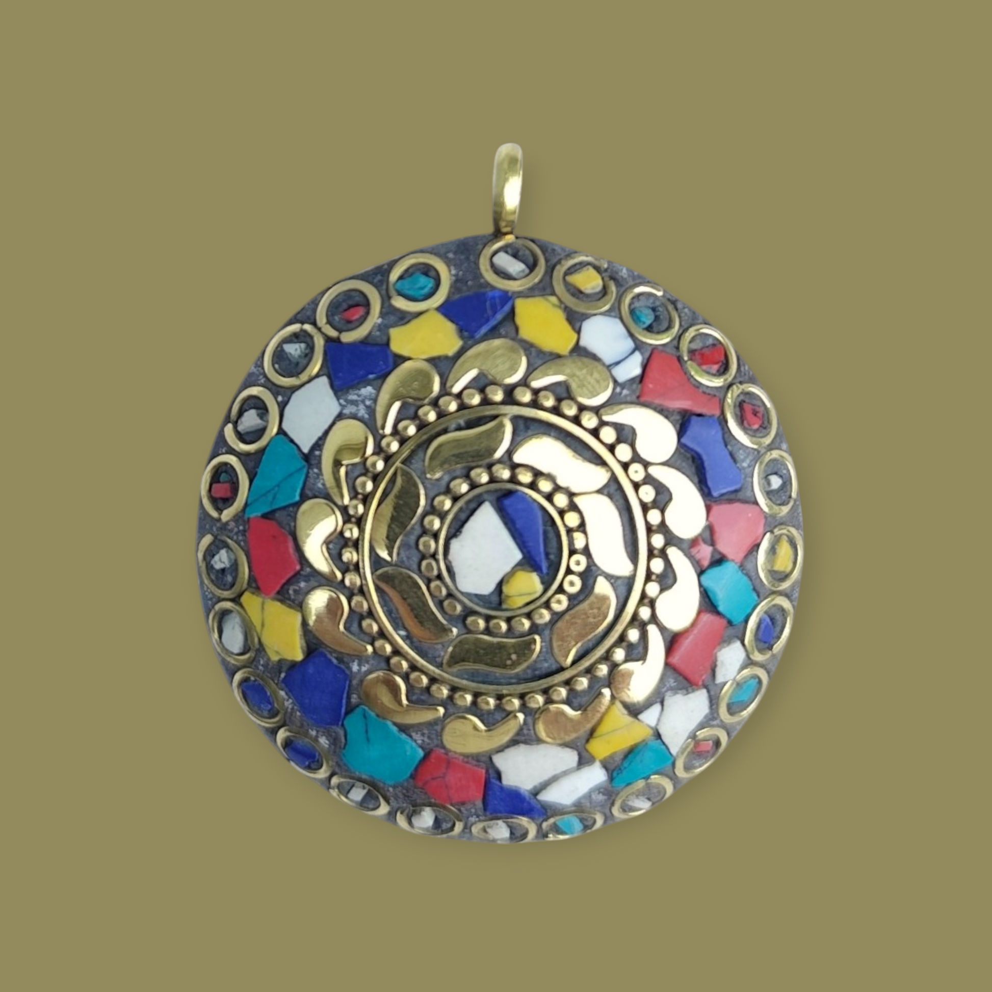 Tibetaanse natuursteen in messing. Doorsnee 5 cm